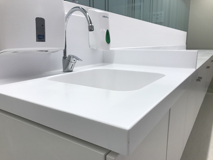 No outro extremo oposto desse contexto, encontramos no mercado o Corian, uma superfície sólida termomoldável, criada pela Dupon, formada por um composto de polímero acrílico e tri-hidrato de alumina, um material derivado da bauxita. Com uma alta tecnologia aplicada, o Corian proporciona 100% de impermeabilidade, não é poroso, é homogêneo, é flexível quanto a sua forma física, resistente às abrasões do processo de higiene, resistente a aplicações em espaços de alto tráfego e com elevada possibilidade de design. Sem dúvida é o produto ideal para a utilização em hospitais, áreas críticas e semi-críticas. Embora já encontramos no mercado outros fornecedores de superfícies sólidas termomóldáveis, no Brasil este material ainda possui elevado investimento financeiro.