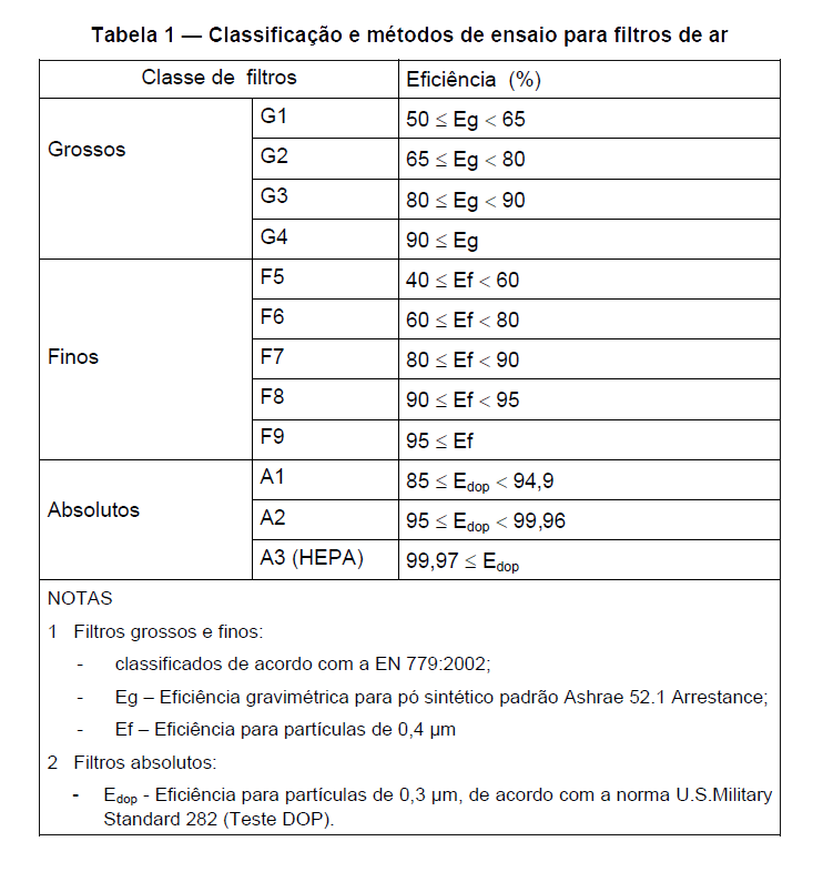 A norma classifica os filtros em grosso, fino e absoluto, sendo esta a ordem crescente de eficiência quanto a pureza do ar. A especificação do filtro varia conforme a classificação de risco ambiental à saúde que o ambiente possua, também descrito nesta norma.