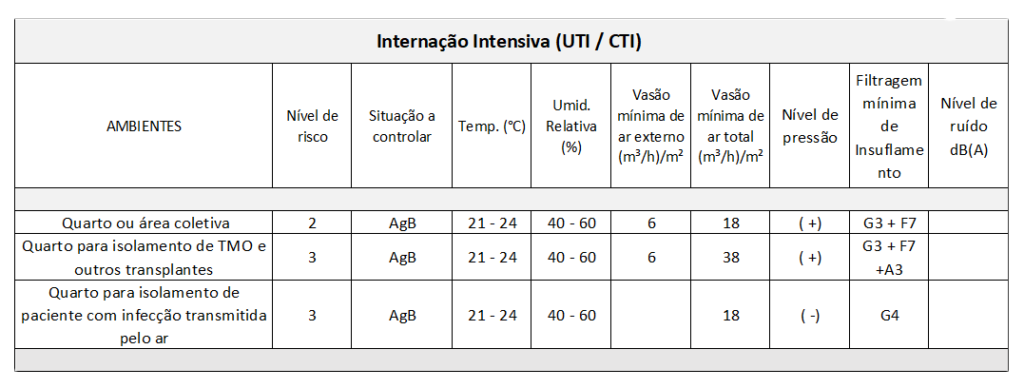 Neste post vou falar sobre as informações relacionadas aos sistemas de climatização em dois pontos: filtragem (grau de pureza) e pressão do ar nas UTIs. Para as UTIs a norma descreve 3 ambientes e suas especificidades, conforme a tabela abaixo: